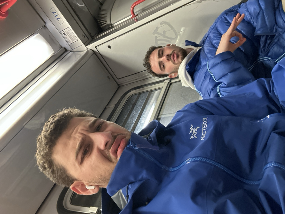 Two young men are in a train car, posing for a selfie. The foreground man wears a blue Arc'teryx jacket and a white earbud. The background man is behind and above him. He is wearing a blue puffy jacket and making an "okay" hand gesture. The train car has gray walls, a window with sunlight, and an overhead light. The number "717" is near the top of the train car. Graffiti is visible on the wall.