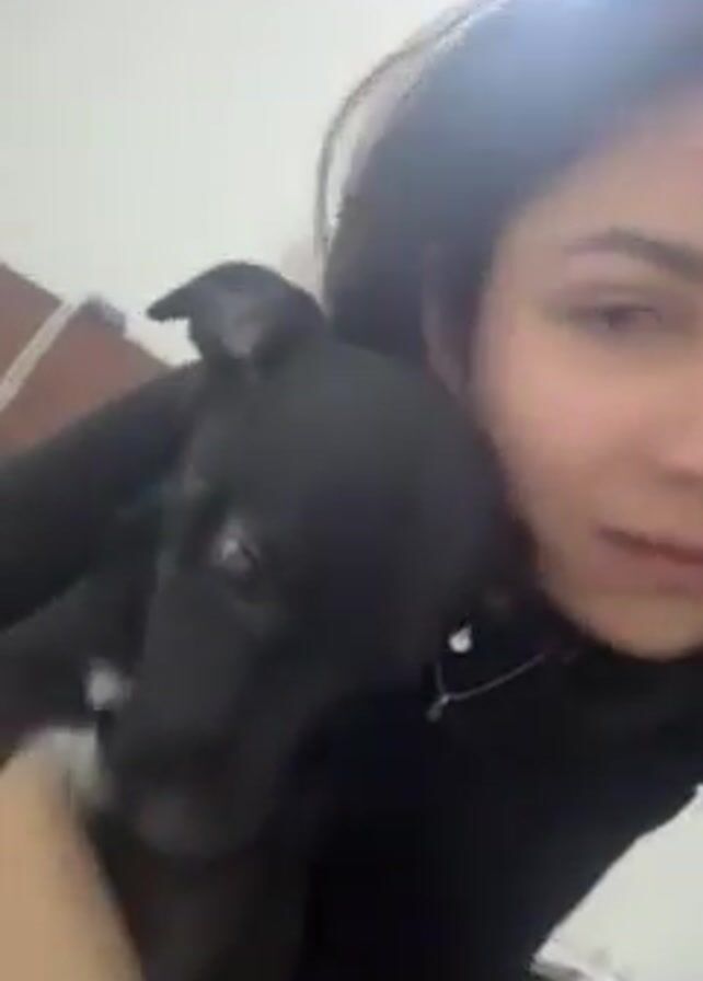A woman with dark hair is holding and kissing a small black puppy with white spots on its chest. The woman is wearing a black shirt and a silver necklace with a small pendant. The background is a plain white wall. The lighting is somewhat bright and overexposed. The woman seems affectionate towards the puppy.