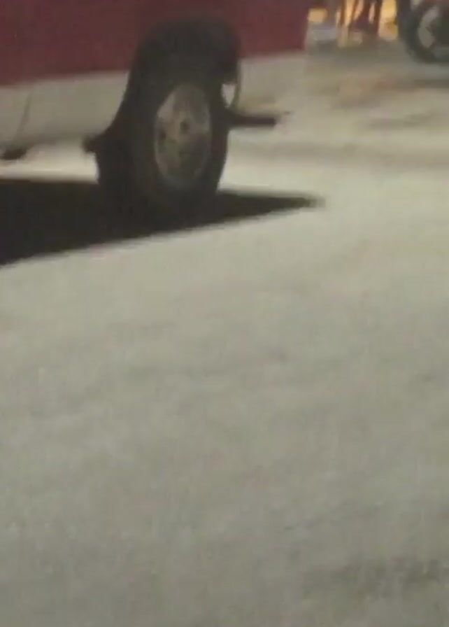 n outdoor gathering at night. A red and white pickup truck is parked to the left of the frame. In the background, a group of people are sitting and standing around a table outside a building. A red motorcycle is parked next to the building. The area is lit by overhead lights.