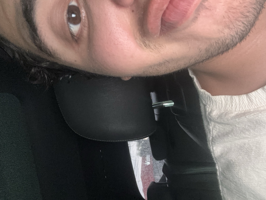 A male individual is depicted in a partial close-up, occupying the right half of the frame. The subject's right eye, part of the nose, and the upper and lower lips, which are pursed, are visible. He has dark, wavy hair and stubble on his cheek and chin. He is wearing a white, textured garment, possibly a t-shirt or a towel, visible on his left shoulder and chest. The scene is set inside a vehicle, indicated by a dark gray or black headrest positioned to the left of the subject, and a dark car interior roof lining above. Through the rear window of the vehicle, a red building is visible with a white "Santander" logo and text. Water droplets are present on the exterior of the car window, suggesting rain or condensation. The lighting is dim, consistent with evening or overcast conditions. The location is near a Santander bank branch within the city of Mérida, Mexico.
