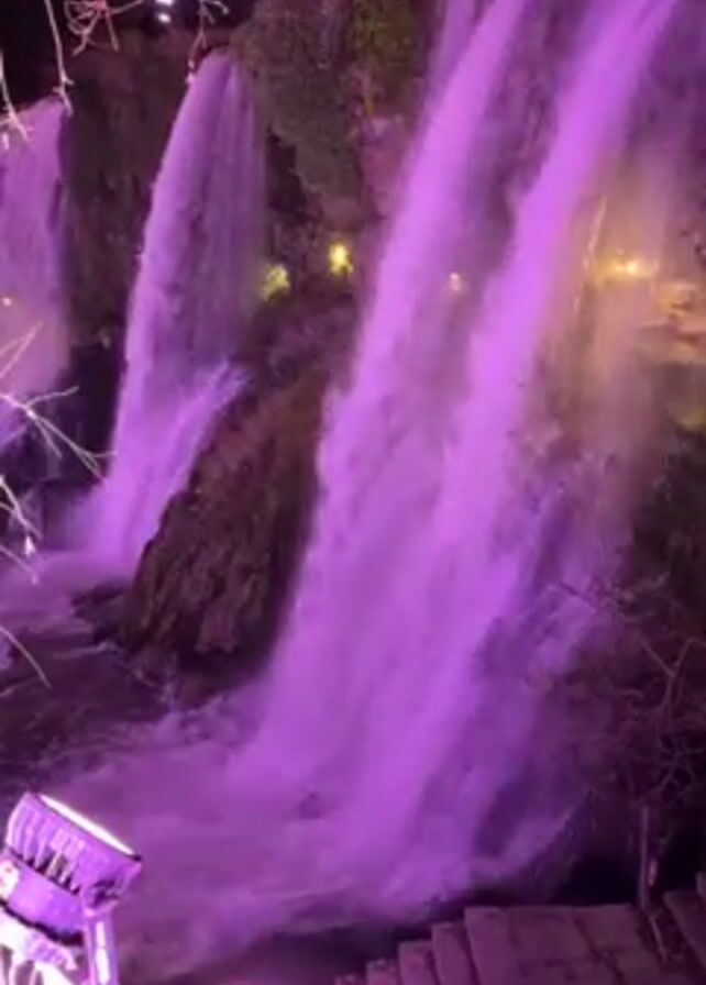 waterfall at night, illuminated with purple lights