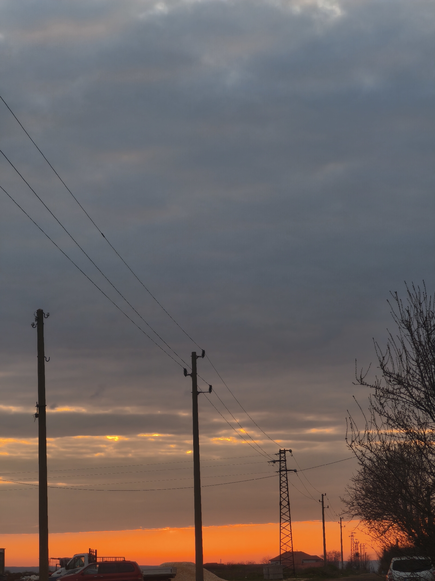 The image captures an outdoor scene at either sunrise or sunset in Slavyanovo, Bulgaria, presenting a distinct horizon line where a bright orange glow from the sun transitions into a band of darker orange, then to a predominantly grey and overcast sky. Streaks of brighter orange light are visible through breaks in the lower cloud cover. Multiple utility structures dominate the midground and foreground. On the left, two wooden utility poles are visible, supporting several overhead power lines that extend diagonally upwards and across the frame. Further to the right, a lattice-structure transmission tower stands prominently, followed by a series of additional wooden utility poles receding into the distance along what appears to be a road or path. In the lower portion of the image, the landscape includes what appears to be a semi-developed or construction area. A red passenger vehicle is partially visible in the lower-left foreground. To its right, a white utility van or truck is parked. Piles of light-colored material, consistent with sand or gravel, are present on the ground. A single-story building with a reddish-brown roof is silhouetted against the orange sky in the midground, to the left of the transmission tower. On the far right, a deciduous tree with bare branches is silhouetted against the sky. No individuals are visible, and no specific actions or interactions are depicted.