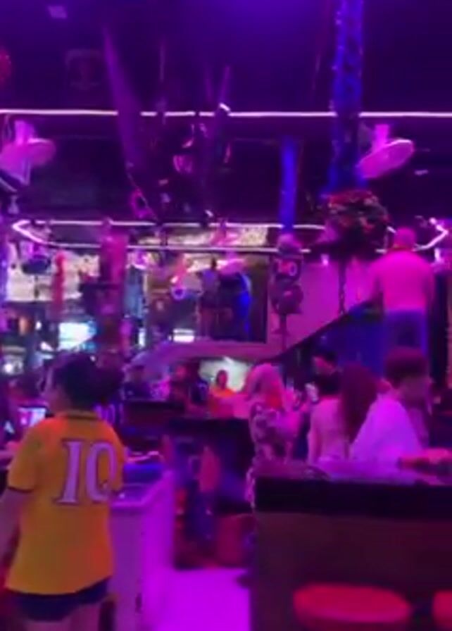 A video depicts a bar with multiple people inside. The room is lit with bright purple and blue neon lights, and there are several ceiling fans. Patrons stand around and sit at the bar. A man stands shirtless on top of the bar, holding onto a pole. Another individual dances on a pole to his right. Several others appear to be on a slightly elevated platform towards the back of the bar. The bar itself has a white countertop and red bar stools. A woman with dark hair in a ponytail, wearing a white top and a short skirt, stands in the foreground with her back to the camera, looking towards the dancers on the bar.
