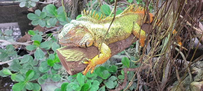 - "A solitary iguana rests horizontally on a piece of light brown wood in a naturalistic habitat, located in Saint-Mandé, France" by FM-u2OAj2, licensed under CC BY 4.0