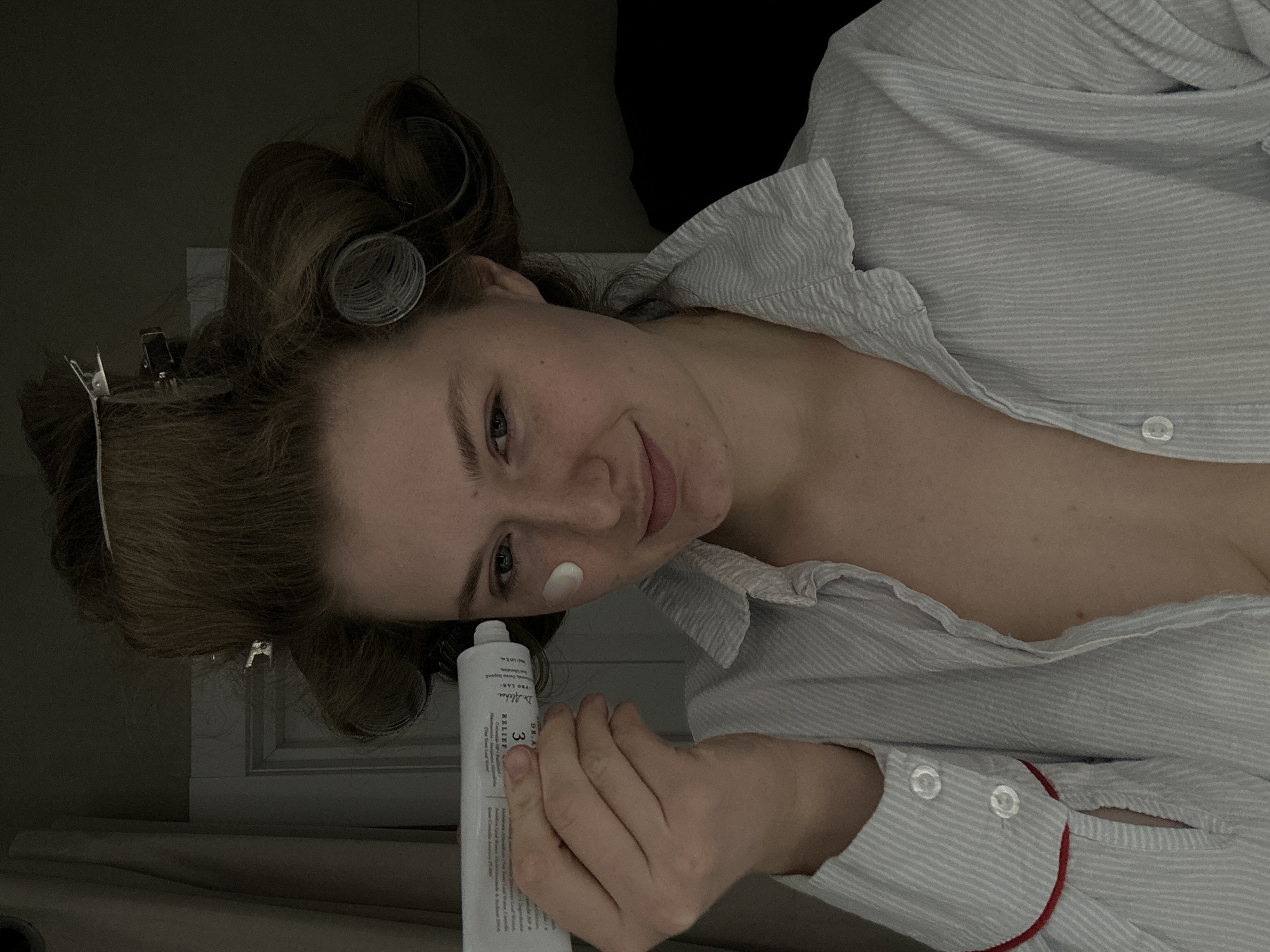 - "A woman is indoors, with hair curlers in her hair, applying a white cream from a white tube to her face" by FM-iSKVh2, licensed under CC BY 4.0