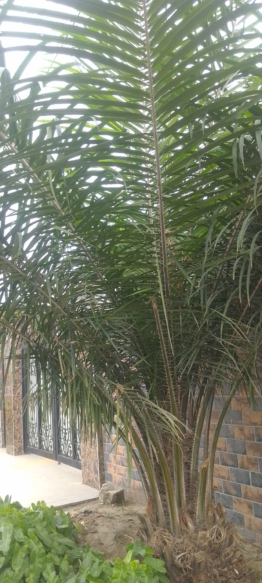 palm tree with long, drooping green fronds in an outdoor setting. The palm tree has multiple stems growing from its base. In the background, there is a wall constructed from dark-colored bricks. To the left of the palm tree, there is a black metal gate set into an archway. In the foreground, there is a patch of green vegetation. The environment appears to be an urban or suburban area, possibly a residential garden or landscaping.