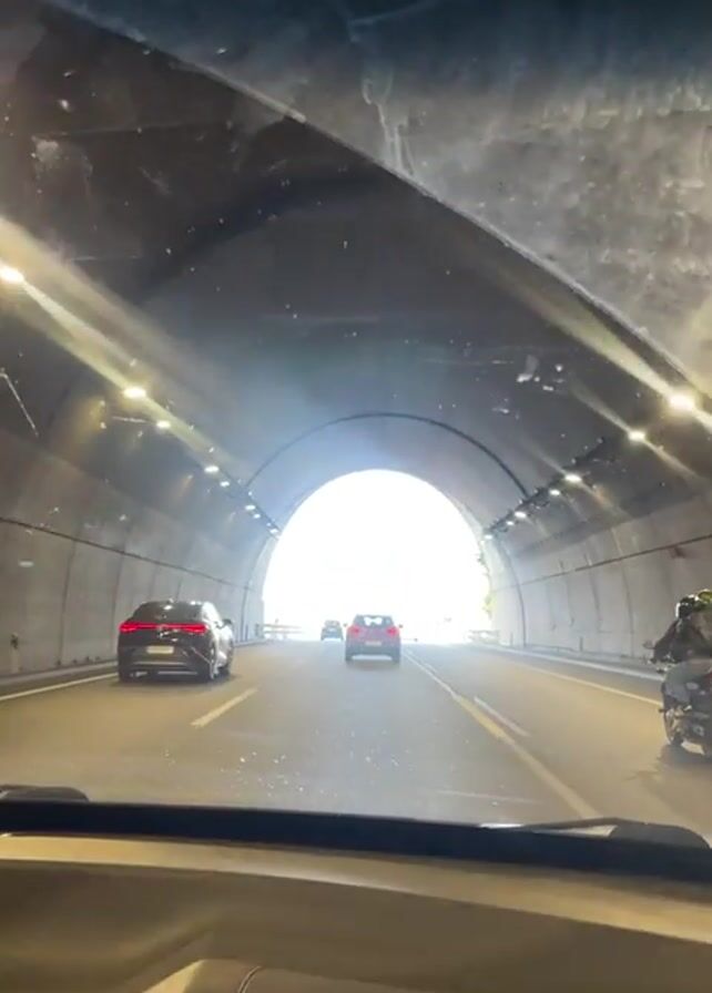 A car travels through a well-lit tunnel on a highway. Other cars can be seen ahead. As the car exits the tunnel, a blue highway sign indicates the direction to Girona, a town on the N-II highway. A motorcycle is alongside the car on the right side. The sky is clear and blue.