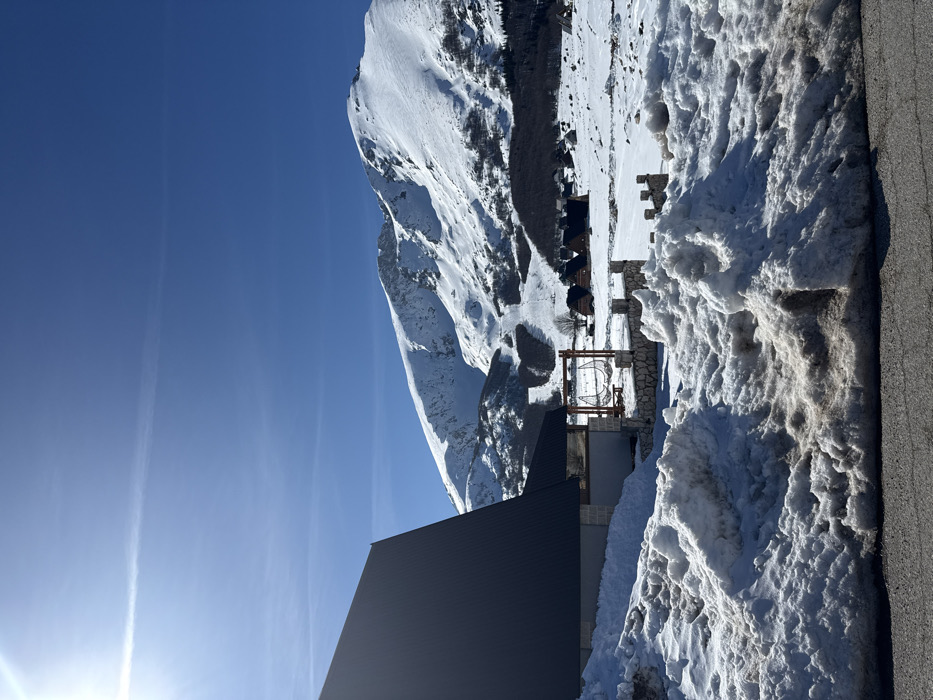 This image depicts a snow-covered mountainous landscape in Virak, Montenegro, under a clear blue sky with intense sunlight emanating from the upper left. In the foreground, a dark asphalt road surface is visible at the bottom, bordered by large, irregular mounds of dirty, partially melted snow. To the left-midground, the corner and side of a modern building with a dark gray, steeply pitched roof and light-colored stone walls are prominent. Adjacent to this building, a stone wall with decorative capstones encloses a small area where a wooden-framed structure supports a large, white fabric hammock or swing. Beyond this, a vast, snow-covered valley extends, dotted with several smaller, dark-roofed wooden cabins. In the background, majestic, snow-capped mountains rise, featuring visible ski slopes and scattered patches of dark, bare trees on their lower flanks. No individuals or specific activities are observable.