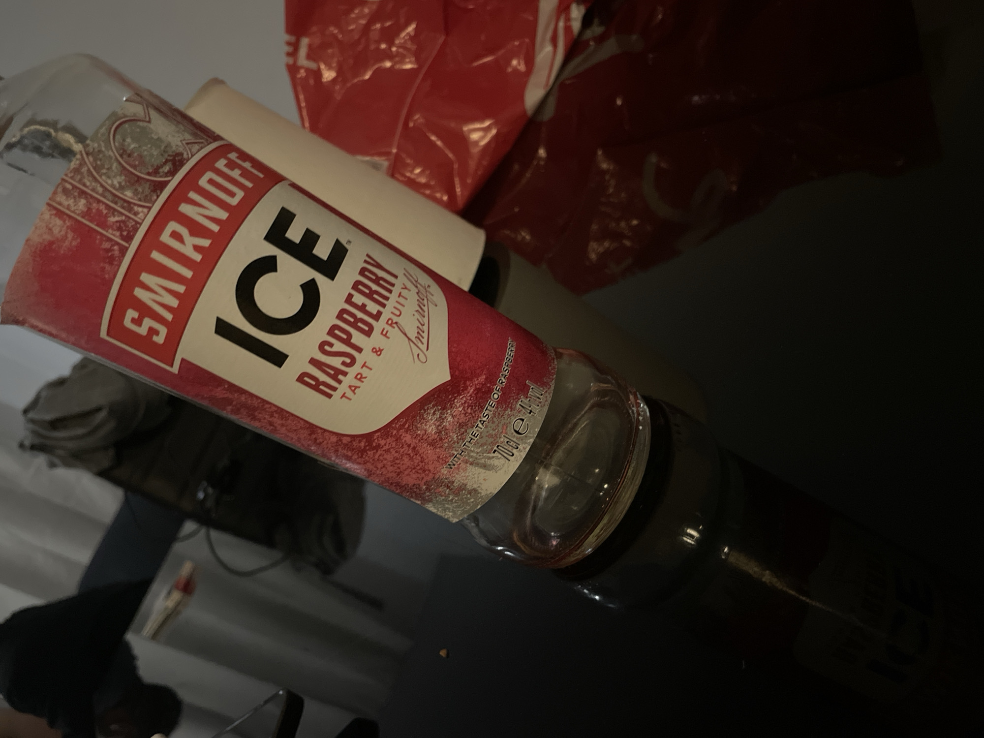 n empty bottle of Smirnoff Ice Raspberry, lying on its side on a dark, reflective surface. The bottle label is prominently displayed, showing the Smirnoff brand and "Ice Raspberry" flavor, with the description "Tart & Fruity". The label also indicates "70cl e 4% vol". In the background, there is a partially visible red plastic bag and some indiscernible items. The scene appears to be indoors, possibly on a table or countertop. There is no indication that the image was taken in Lelystad, Netherlands.