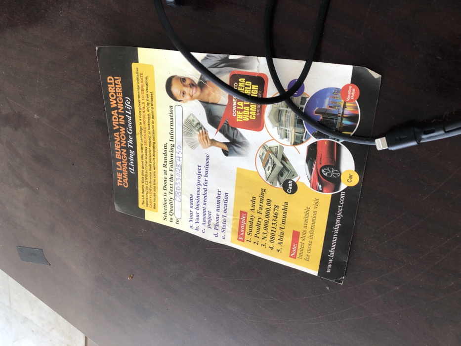 A printed flyer for "THE LA BUENA VIDA WORLD CAMPAIGN" (Living The Good Life), active in Nigeria, rests on a dark brown tabletop surface in an indoor setting in Abuja, Nigeria