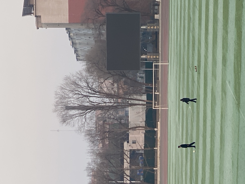 This image depicts an outdoor sports field, likely a football pitch, within the city of Zhongtun, China, under an overcast sky. The field exhibits distinct alternating light and dark green stripes, characteristic of turf maintenance, possibly enhanced by frost. Two individuals are present on the field. On the left, a person wearing dark clothing, potentially a dark jacket and trousers, stands or walks towards the right side of the frame, positioned next to a white football. To their right, a second person, also in dark attire, walks rightward across the field, further from the football. To the far right, near this second individual, a small cluster of reddish-brown objects rests on the field. A white goalpost stands in the mid-ground, marking one end of the field, situated where the green turf meets a red running track. Beyond the track, a low barrier separates the field from a line of bare deciduous trees, indicating a cooler season. To the right, a large, unlit rectangular LED scoreboard is mounted on poles, displaying no active content. Below the scoreboard, Chinese characters are visible on structures, including "厚德博学" and "不忘初心." The background features a cluster of urban structures. To the far left, modular white buildings or containers are visible behind the trees. Further right, a tall building with a red and beige facade, topped with what appears to be solar panels, stands prominent. Behind the buildings, a densely packed residential complex with multiple stories extends horizontally. A slender, distant tower, possibly a communication mast or chimney, is faintly visible against the pale, diffused sky towards the left of the background.