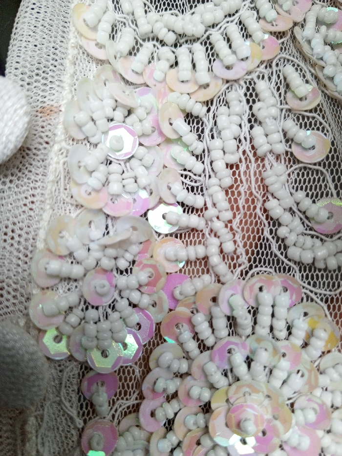 - "An intricate design features shimmering, iridescent sequins arranged in floral patterns interspersed with delicate, netted lace" by FM-J9COi1, licensed under CC BY 4.0