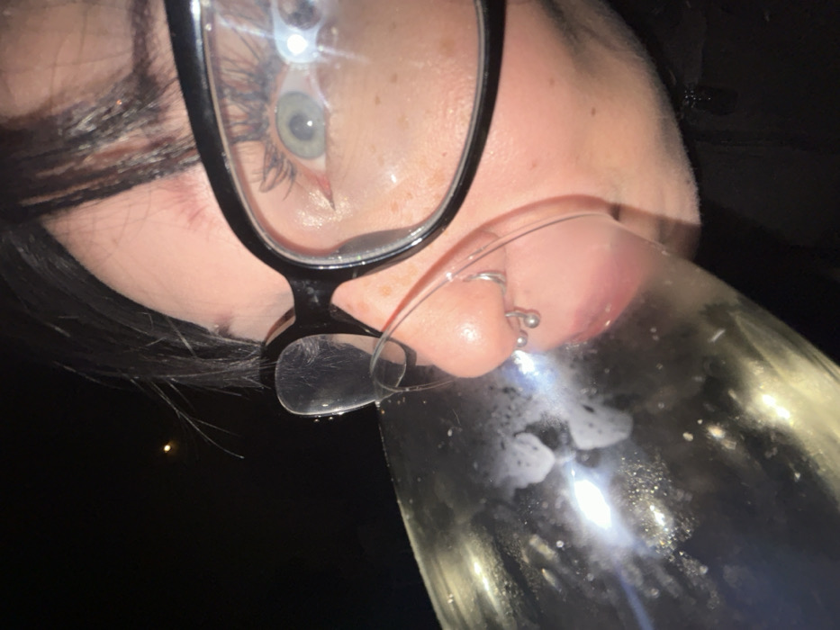 A close-up, low-light photograph captures the right side of an individual's face, actively drinking from a clear glass in the city of Unknown, Unknown. The individual has dark hair visible on the forehead and temple, a light-colored (blue/green) right eye with long eyelashes, and wears black-framed spectacles. The nose features a metallic septum piercing (horseshoe barbell or ring) and two small metallic studs on the visible right nostril. The glass contains a light-colored liquid, possibly a sparkling beverage, indicated by foam and reflections on its inner surface, and is pressed against the individual's upper lip and nose. The background is dark, suggesting an outdoor night setting or a dimly lit indoor environment, with a single, distant bright light source visible in the upper left. A dark garment is visible below the chin.