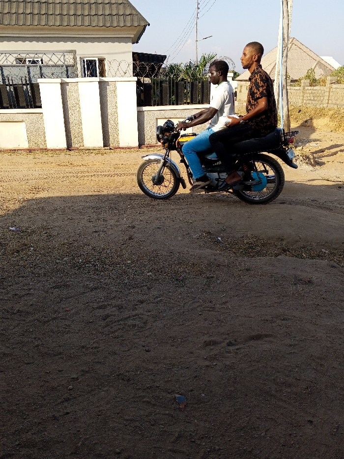 - "The image displays two adult males riding a silver and black motorcycle on a dusty reddish-brown dirt road in Adonkolo, Nigeria" by FM-XS7TG3, licensed under CC BY 4.0