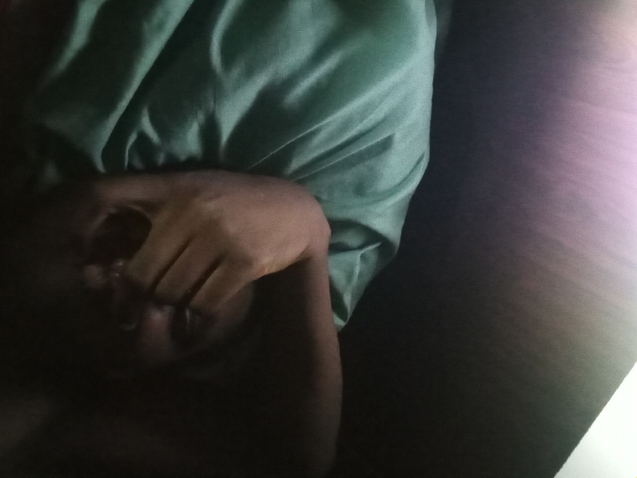 A dimly lit, close-up photograph depicts a dark-skinned individual lying supine, partially covered by a rumpled teal-green fabric
