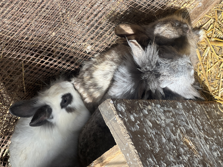 A white rabbit with black markings around its eyes and on its ears is positioned above a gray-brown rabbit, which is lying down. Both rabbits are contained within an enclosure. The background features a weathered, rectangular wire mesh cage, and a rough wooden structure, possibly a hutch or nesting box, is visible on the left side of the frame. Yellowish straw or hay covers the floor of the enclosure. The scene is illuminated by natural sunlight, casting distinct shadows. This event is observed in the city of Ashkelon, Israel.