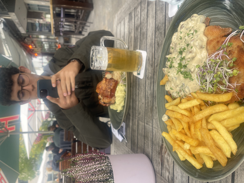 - "An outdoor dining scene in Dortmund, Germany, features a young adult male with dark curly hair and glasses, wearing a dark green jacket, holding a dark-colored smartphone to photograph food on a wooden plank table" by FM-7a4n42, licensed under CC BY 4.0