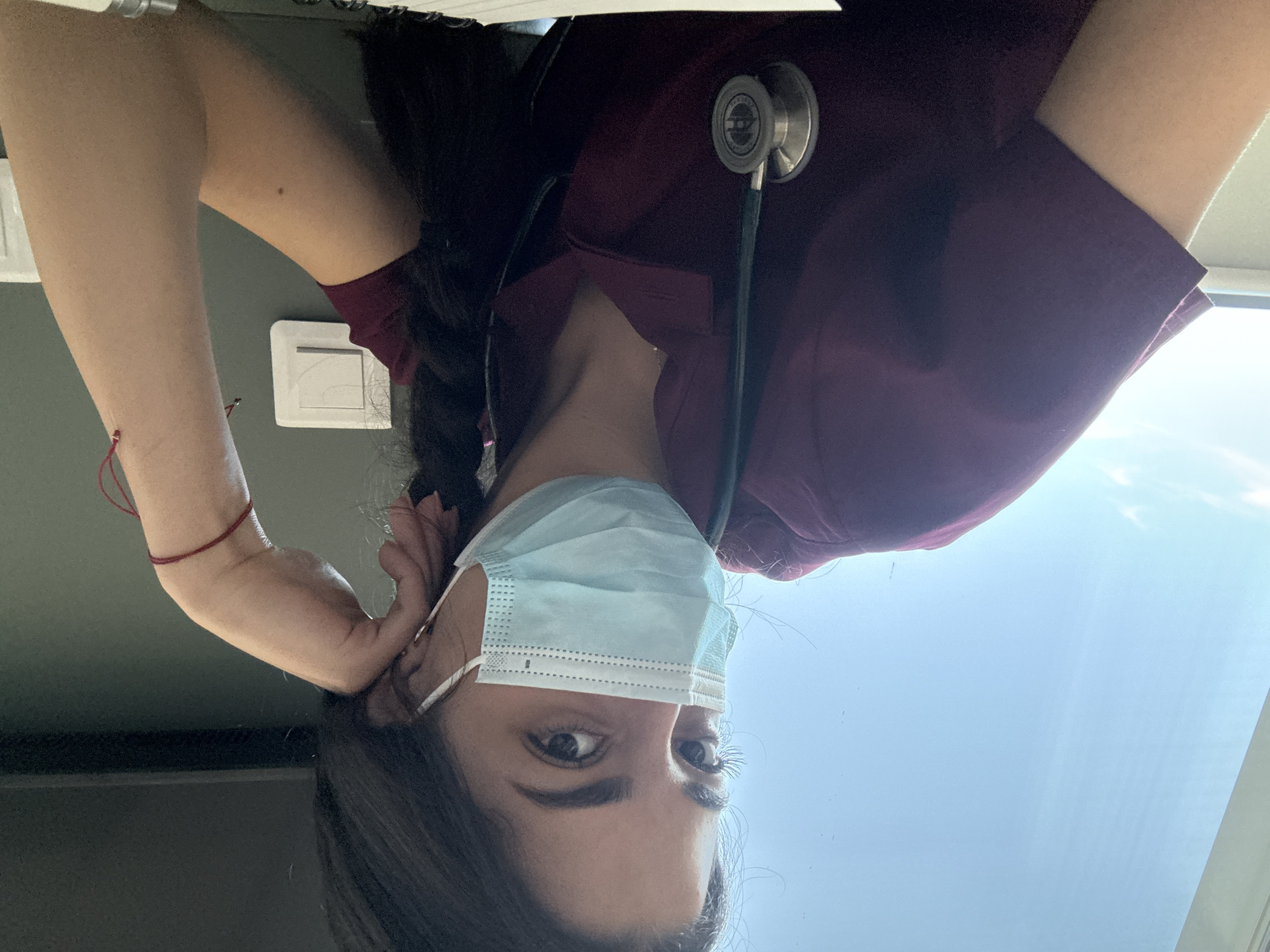 A woman wearing a burgundy scrub top and a light blue surgical mask looks at the camera. She has dark hair and a stethoscope around her neck. Her left arm is raised with a red string bracelet visible on her wrist. The background includes a gray wall with a light switch and a bright sky. The image is oriented upside down.