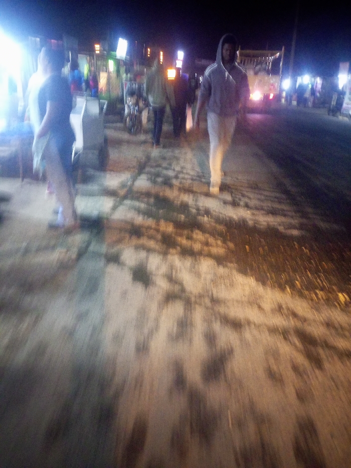 A blurry, low-quality image depicts a nighttime street scene. Several people are visible, including a hooded figure walking towards the camera. Other individuals are near vendor stalls with bright lights. A vehicle, potentially a truck, stands in the background. The ground appears to be cracked or uneven with patches of light and shadow. The overall image suggests a busy, urban environment at night.