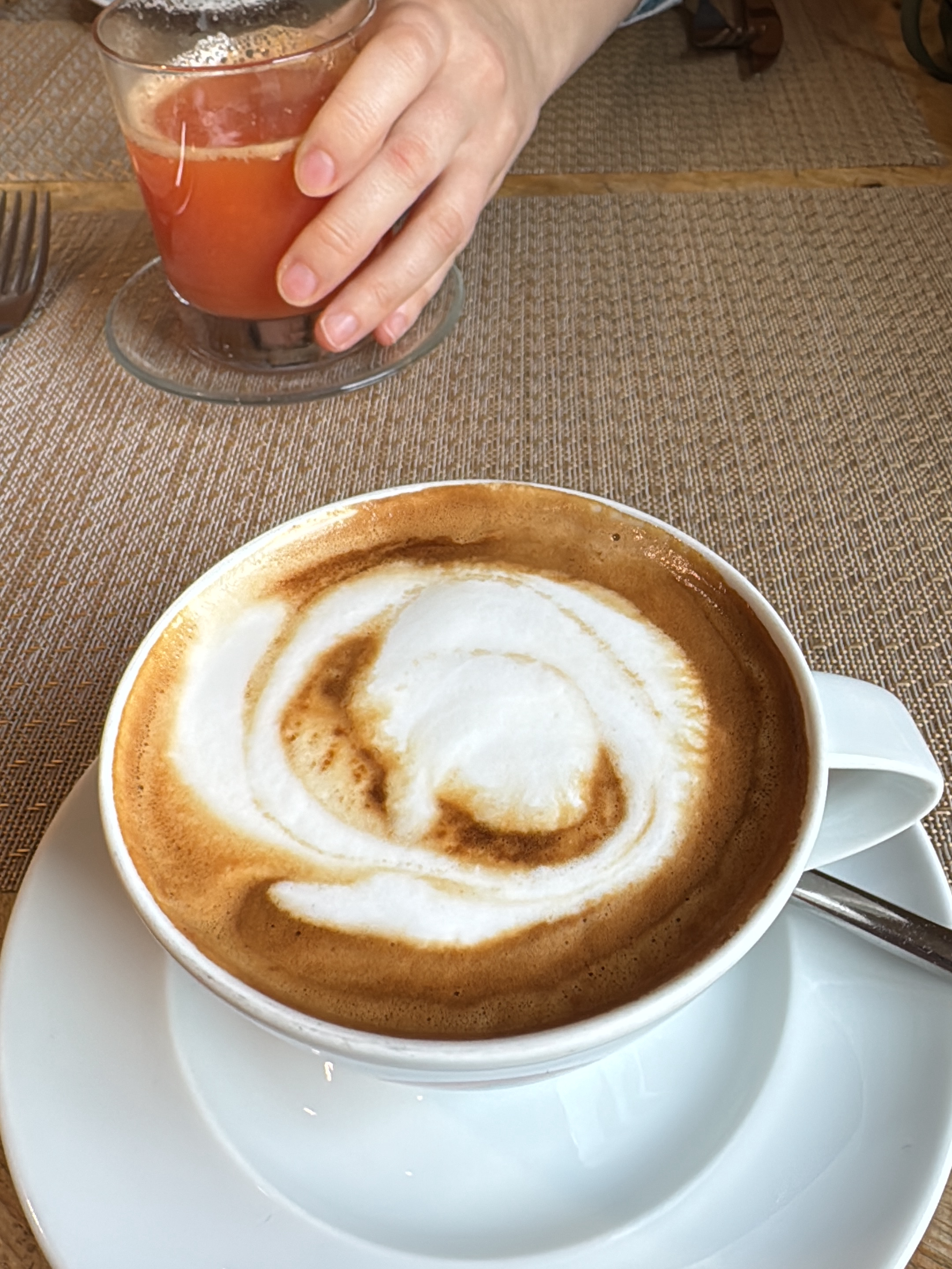 The image depicts a tabletop scene at a café or restaurant in Como, Italy. In the foreground, a white ceramic cup holds a cappuccino featuring a prominent white foam spiral latte art design, resting on a matching white saucer. A silver spoon is positioned on the saucer to the right of the cup. In the upper left background, a light-skinned human hand grasps a clear glass containing a reddish-orange liquid, likely a beverage like juice, which is placed on a clear glass coaster. A silver fork is partially visible to the left of the glass. All items are situated on a light brown, textured woven surface, possibly a placemat or tablecloth, with a geometric pattern. A darker wooden surface, likely a table edge, is visible in the upper right.