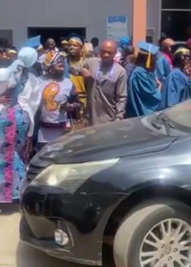 group of people gathered outside a building, some of whom appear to be celebrating a graduation. A dark-colored car is parked at the edge of the crowd, and several people are standing near it. Some individuals are wearing graduation gowns and caps, while others are dressed in traditional African attire. There are also people in business casual clothing. The building behind the group has signage indicating TETfund and mentions "Normal Intervention." Another sign shows the number 9964. There are multiple cars in the scene, including a white car with a "PLATEAU" license plate visible. The atmosphere seems lively and celebratory.