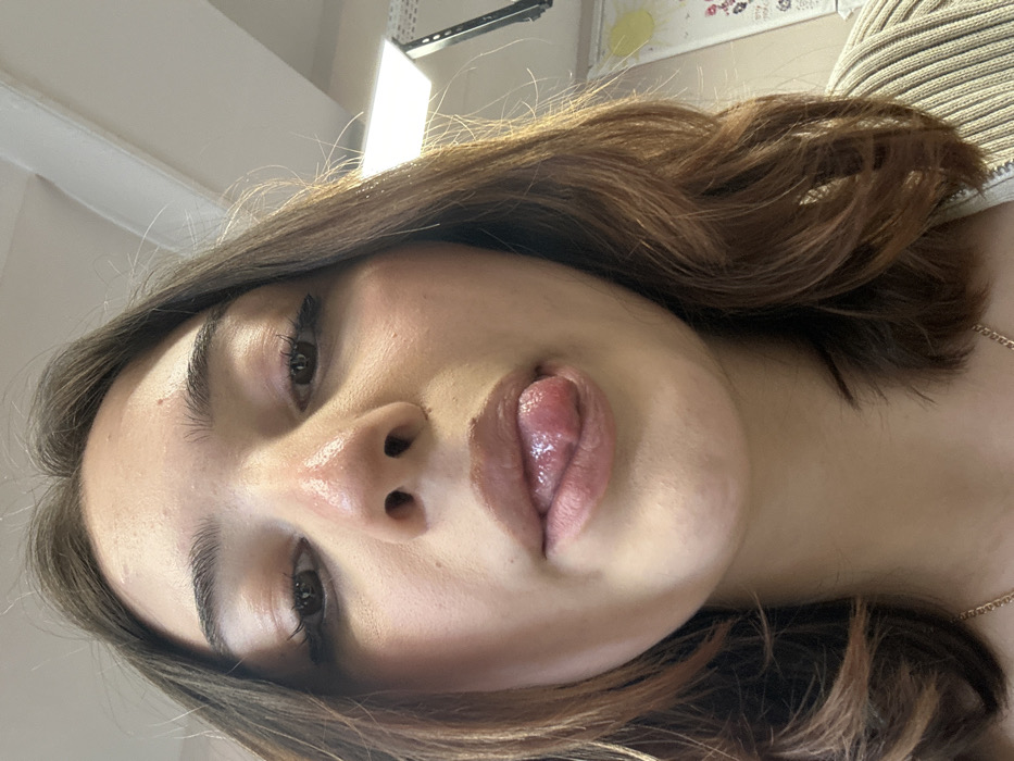 A female subject is depicted in a close-up, low-angle portrait, looking directly forward. Her medium-brown, wavy hair frames her face. Facial features include a fair complexion with evident shine on the nose and forehead, eyes with dark eyeliner, and lips displaying a light-colored gloss. Her tongue is extended, resting on the lower lip. She wears a thin, light-colored chain necklace and a ribbed garment, likely beige or off-white. The background is an indoor environment featuring a white ceiling with a rectangular fluorescent light fixture positioned in the upper right. A dark, structural element is partially visible to the right of the light, and a blurred yellow, circular object is discernible against a light wall further right. The depicted scene is located in Strasbourg, France.