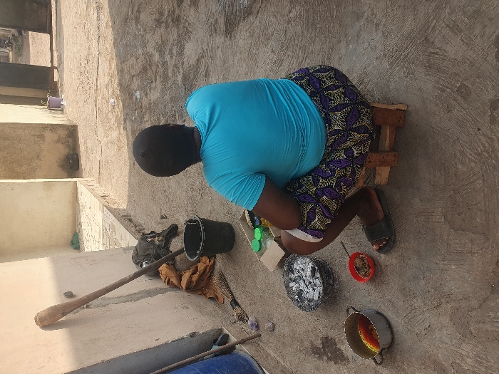 An outdoor scene in Lokoja, Nigeria, displays an individual seated on a low wooden stool on a concrete surface, viewed from behind