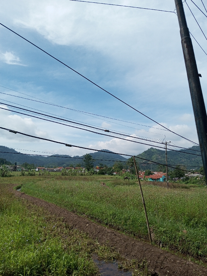 The scene captures a rural landscape in Kandenuwara, Sri Lanka. The foreground features a narrow, elevated dirt path running diagonally from the lower left, separating a small water-filled ditch on its left from an overgrown field of green vegetation on its right. The midground consists of an expansive green field with tall, dense plant growth, interspersed with some drier, brownish patches. A slender, light-colored wooden pole leans slightly to the right within this field. In the background, a cluster of residential structures with varying roof colors, including terracotta and a distinct blue-green, are visible amidst trees at the base of prominent green, forested mountains. The sky above is light blue with scattered white cumulus clouds. Multiple black utility wires traverse the upper and middle portions of the frame, originating from a dark, partially visible utility pole on the far right. No people or animals are discernible.