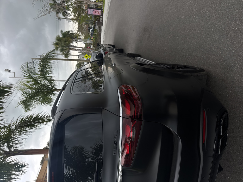 An outdoor scene in Naples, United States of America, depicts a matte black Mercedes-Benz GLS 63 SUV stationary on a dark asphalt road, viewed from its rear-left quarter