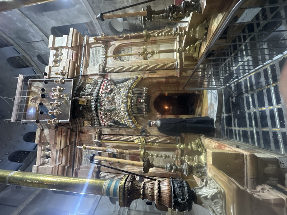 The image displays the interior of the Church of the Holy Sepulchre in the Christian Quarter of the Old City of Jerusalem, Israel