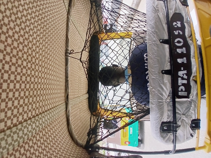 The image provides an interior view from the rear passenger compartment of a three-wheeled auto-rickshaw, looking forward on a street in Kwekwe, Zimbabwe. The vehicle's ceiling is lined with a light-colored fabric featuring a repeating brown checkered pattern. A black mesh cargo net is suspended across the front interior section, above the driver's compartment. A light grey, possibly plastic or fabric, cover drapes over a partition or seat directly in front of the viewer, to which a black rectangular panel displaying "PTA-11052" in white stenciled text is affixed. The back of a male driver, wearing a dark blue shirt, is visible in the front seat. Directly ahead and slightly to the left, another three-wheeled auto-rickshaw is visible through the front opening, featuring a turquoise lower body and a yellow upper body/roof. Its rear license plate, "A-5990L", is partially visible. The background consists of blurred street elements, indicating an urban setting.