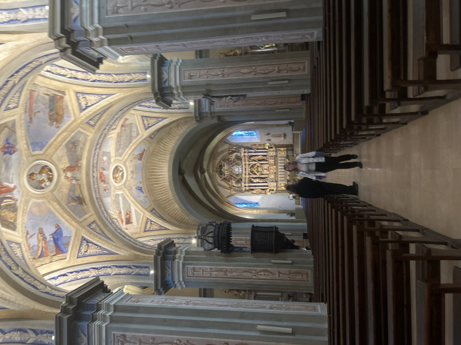 The interior of a grand church features ornate architecture. A frescoed dome with religious scenes overlooks the nave. Rows of wooden pews line the sides of the aisle, leading towards a decorated altar and stained-glass windows. Two figures are walking towards the altar, standing out amidst the intricate details of the church's design. The light illuminates the artistic patterns on the ceiling and walls.