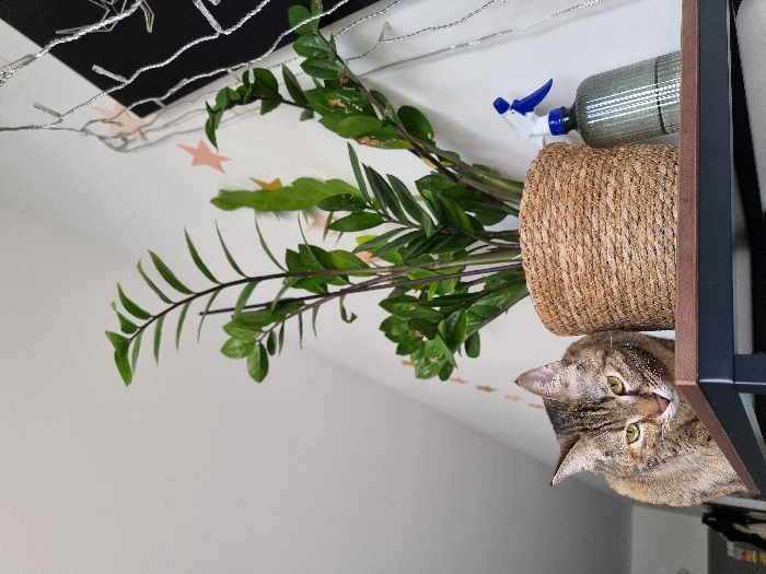 The image depicts an indoor scene on a dark brown wooden shelf supported by a black metal frame. On the left side of the shelf, a domestic short-haired tabby cat with brown and black striped fur and greenish-yellow eyes is positioned, looking slightly downward and forward. To the right of the cat, a Zamioculcas zamiifolia (ZZ plant) with dark green foliage is contained within a round, woven natural fiber pot. Further to the right on the same shelf, a transparent, ribbed glass spray bottle with a blue and white nozzle is present, containing a clear liquid. The background consists of a white wall decorated with multiple light-colored star-shaped cutouts. In the upper right quadrant, a string of clear lights is draped against a dark, possibly black, rectangular panel affixed to the wall. Indistinct elements of an interior room are visible in the far-left background. The scene is located within a residence in Ramat Gan, Israel.