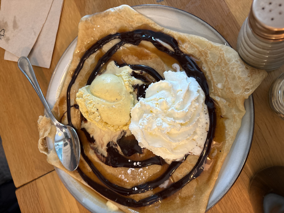 A close-up, high-angle view captures a dessert served on a light-grey rimmed white plate, resting on a light brown wooden tabletop in Versailles, France. The central subject is a large, golden-brown crepe, folded irregularly. It is generously topped with a dark brown chocolate sauce and a lighter, amber-colored syrup, both drizzled in concentric circular patterns. A scoop of light yellow, possibly vanilla-bean, ice cream with a slightly granular texture sits near the upper center, showing signs of melting. Below it, a substantial mound of white whipped cream is placed. A light dusting of powdered sugar is visible across the crepe and sauces. A silver-colored metal spoon with a simple handle rests diagonally across the upper left portion of the crepe, its bowl partially submerged in the toppings. In the upper right background, two folded, light brown paper napkins are visible. The lower right foreground shows the top portion of a clear, ribbed shaker, and a reflective object is partially visible in the lower left.