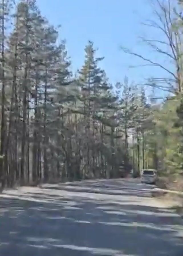 car driving on a paved road through a forest. The trees on either side of the road are tall and mostly pine, with some bare branches visible. The sky is blue and clear. Another vehicle is visible far down the road. The lighting is bright. The footage is from the point of view of the driver.