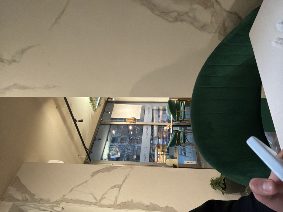 This image depicts the interior of the Georgian Bakery, located at ul. „Княз Борис I“ 67, Varna Center, 9000 Varna, Bulgaria. The scene is captured from a seated position, with the back of a dark green velvet upholstered chair dominating the lower-middle foreground and a human hand holding a white smartphone visible in the lower-left. The interior features light-colored walls with prominent grey veining, mimicking marble. A rectangular opening in the wall frames a view into another section of the establishment and through a large, full-height glass storefront looking out onto a city street. Through the storefront, two dark green velvet upholstered chairs with gold-colored metal frames are arranged around a small, light-colored circular table. A wooden pendant light fixture hangs near the center of the glass expanse. A black track lighting system with multiple spotlights is installed along the ceiling within the seen interior space, and artificial hanging greenery is visible near the ceiling on the right side of the opening. Reflected text on the glass storefront clearly shows the word "GEORGIAN" in reverse. Beyond the storefront, the exterior appears dark, suggesting evening or nighttime. Distant buildings with illuminated windows and streetlights are visible across what appears to be a city street. A potted plant is situated on the floor to the left of the storefront.