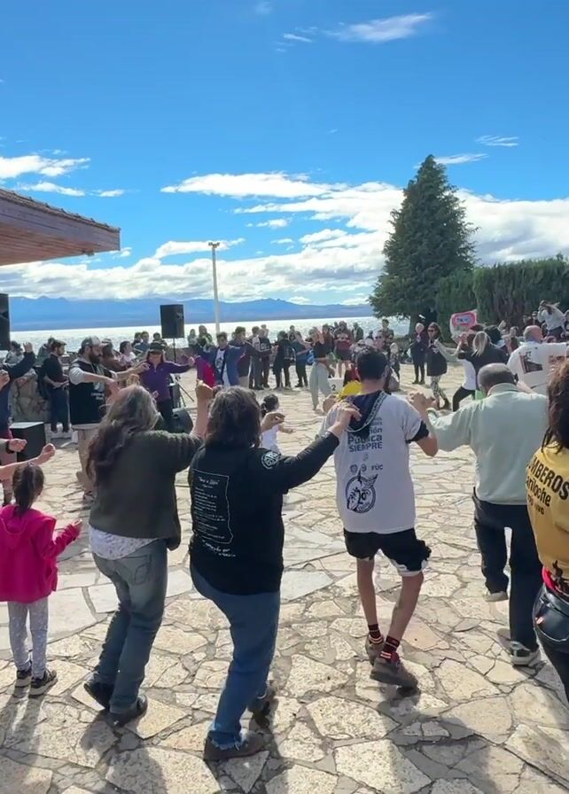 A wide-angle shot captures a large group of people dancing in a public area on a sunny day with a bright blue sky dotted with fluffy white clouds. The dance is taking place on a stone-tiled plaza adjacent to a building with a wooden roof and glass windows, set against a backdrop of a wide lake or sea and distant mountains. Tall green trees stand on the right side of the frame. The crowd is diverse, with people of all ages, including children, and various ethnicities participating in the dance. They are dressed in casual clothing, including t-shirts, jeans, and jackets, with a few wearing hats or beanies. Some individuals are holding small children or babies. A few people stand on the edge of the crowd, watching the dancers. On the left side of the frame, a small table is set up with flyers or signs, indicating a possible event or gathering. The scene suggests a community event or celebration.