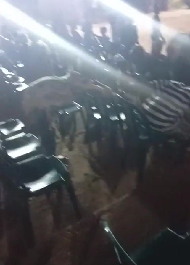 nighttime gathering, likely outdoors, with rows of people seated in plastic chairs. A bright light source shines over the crowd, creating strong shadows and making it difficult to discern individual features. Some people are walking around. The setting appears to be a somewhat unkempt area.