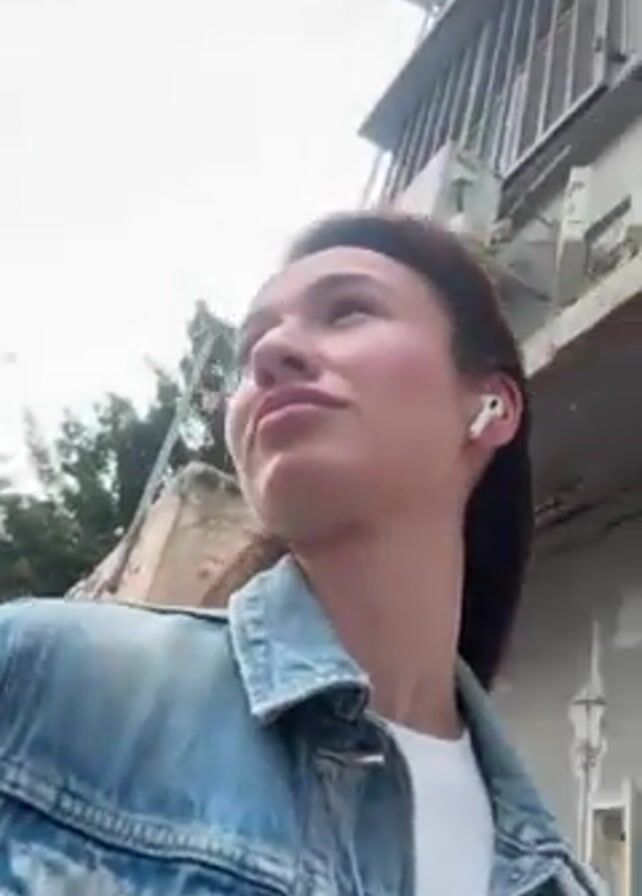 A young woman with long brown hair is walking outside. She wears a blue denim jacket and white shirt. She has wireless earphones in. The camera angle is low, looking up at the woman. The background shows buildings with air conditioning units and a cloudy sky. Sirens can be heard in the audio.