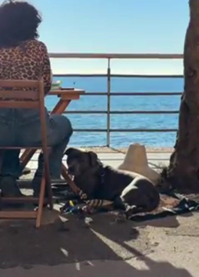 A woman sits at a small, wooden table by the sea, facing away from the camera. She is wearing a leopard-print shirt and jeans. A large, gray dog lies at her feet, under the shade of the table and a tree. Behind them is a metal railing and the ocean, with a clear, blue sky above. In the background, people walk past on the sidewalk. A seagull walks along the concrete barrier by the ocean in the distance.