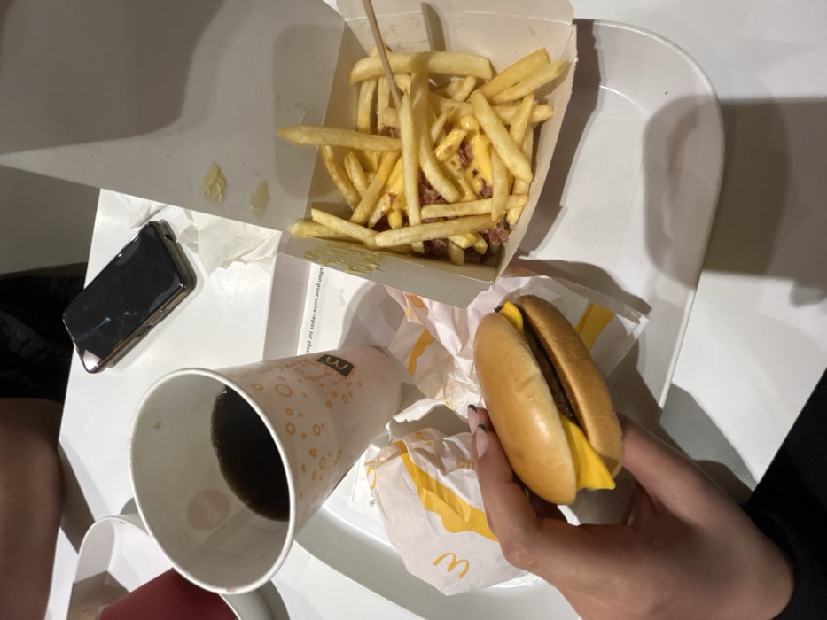 The scene depicts a McDonald's meal on a white plastic tray, situated on a white table within a McDonald's restaurant in Souffelweyersheim, France. A human left hand, exhibiting dark-tipped manicured fingernails, holds a cheeseburger comprising a bun, a meat patty, and a single slice of yellow cheese. Adjacent to the burger, a white McDonald's paper cup, marked with a yellow "M" logo and orange speckles, contains a dark carbonated beverage approximately halfway to full. To the right, a cardboard fry container holds golden french fries, which are topped with melted yellow cheese and fragmented dark red bacon bits; a small wooden skewer is inserted among the fries. Crumpled yellow and white McDonald's wrapping paper is visible near the burger. A black smartphone, enclosed in a dark protective case, lies face-down on the white table surface in the upper right quadrant of the image, resting partially on a crumpled white napkin. A dark-clothed limb of an additional individual is partially visible in the upper left background.