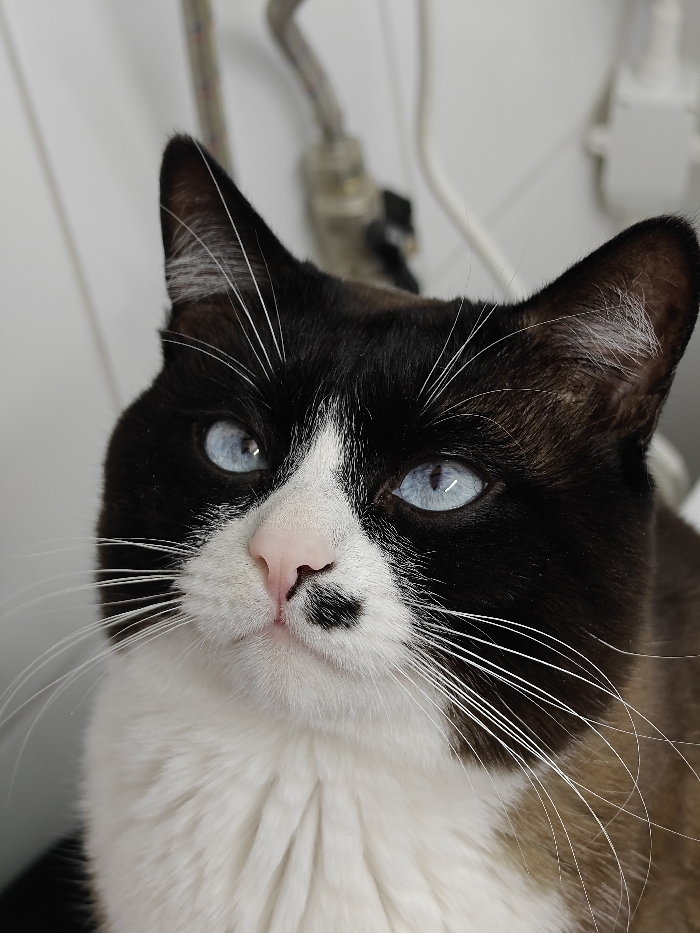 - "A close-up shot reveals a snowshoe cat with striking blue eyes, a pink nose marked with a black spot, and long white whiskers" by FM-eMutn2, licensed under CC BY 4.0
