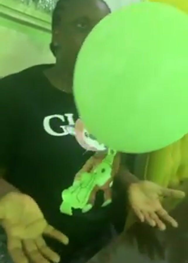 A woman wearing a black t-shirt is sitting at a table and tossing around two balloons. One balloon is light green, and the other is yellow. She throws the balloons upward and then catches them. She looks around as she handles the balloons. There is green holiday garland behind her and flowers on the table. The room is lit with a green light.