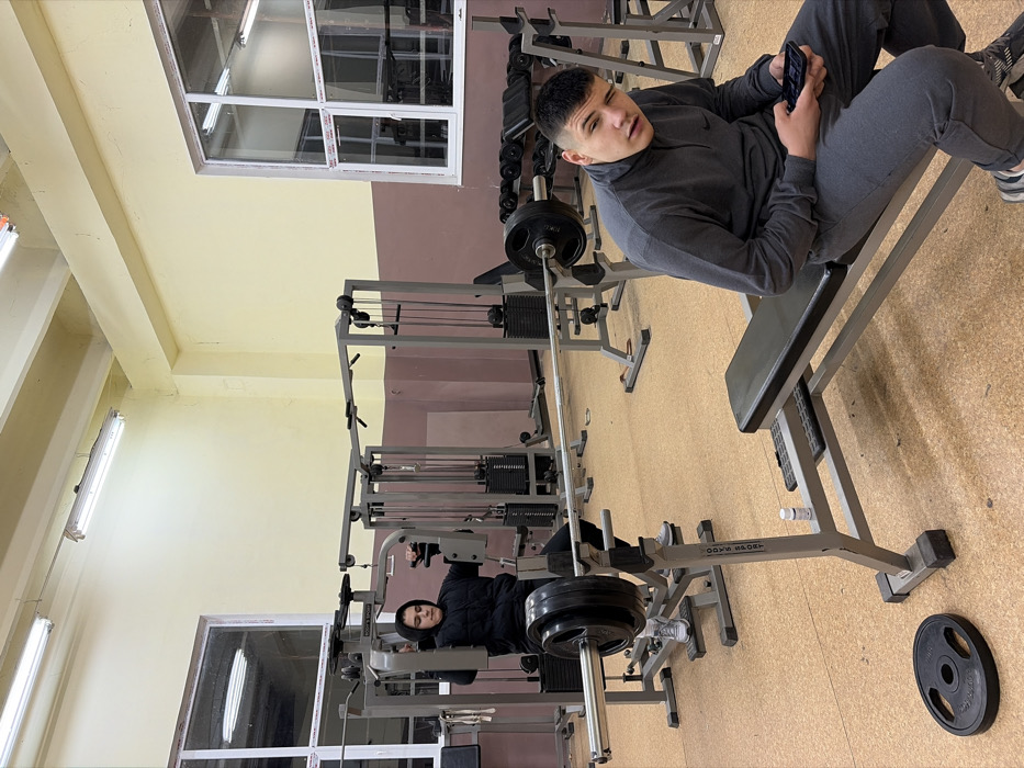 The scene depicts an indoor gym located in Panagyurishte, Bulgaria. The room features walls painted light yellow on the upper portion and maroon on the lower, with a light brown, possibly cork-tiled, floor. Overhead, linear fluorescent light fixtures provide illumination. Two large, multi-pane windows with white frames are visible on the left and right walls, reflecting internal light sources. In the mid-ground, a young individual with dark hair, wearing a black hooded puffer jacket over a dark garment, is seated on a grey "BODY'S SPORT" chest press machine. This individual is actively engaged in the exercise, with both hands gripping the machine's handles. To the right and in the foreground, a young male with short dark hair, dressed in a dark grey quarter-zip long-sleeved shirt and matching sweatpants, is seated on a black weight bench. He is looking directly towards the viewer with his right eye partially closed and is holding a dark-colored smartphone in both hands, resting over his lap. A silver weight bench press station with a barbell loaded with black weight plates (approximately two on each side) is positioned between the two individuals. A small white cylindrical bottle with a blue cap is visible on the frame of this bench press. A single black weight plate lies flat on the floor to the left of the bench press station. In the background, several other grey multi-station cable machines with weight stacks, along with a rack of dumbbells, are arranged against the walls. No direct interaction is observed between the two individuals.