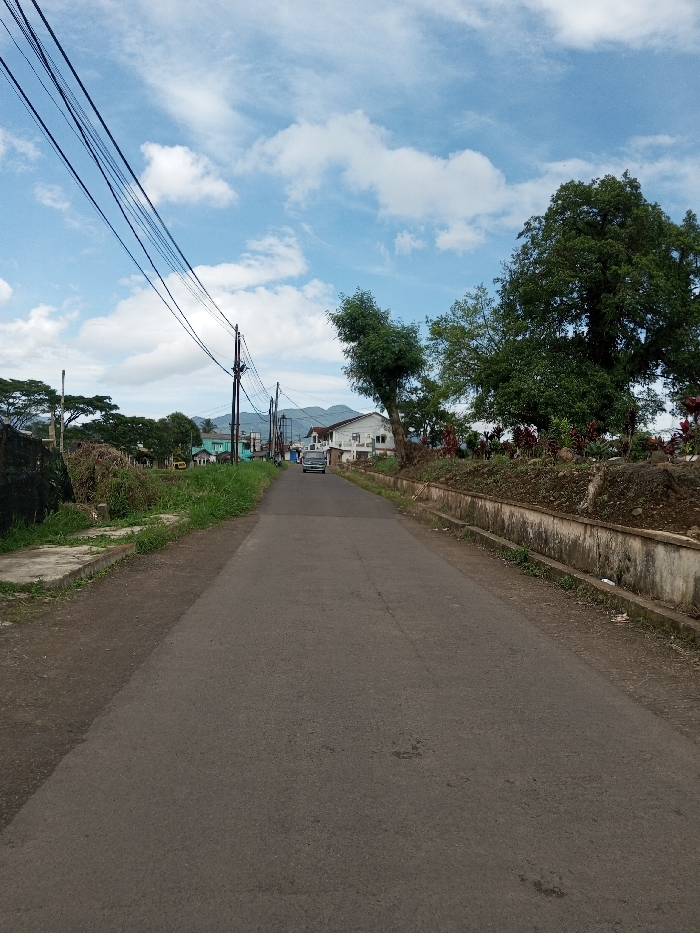The image depicts a paved, two-lane road in Ariyalai, Sri Lanka, viewed from a low angle looking down the length of the road. The asphalt surface is dark grey and shows minor wear, extending into the distant horizon. No lane markings are present. On the left side of the road, a narrow dirt shoulder transitions to a concrete path in the foreground, followed by an overgrown area of green grass and weeds. Beyond this, a series of wooden utility poles with multiple black electrical wires extend diagonally across the upper left sky. In the mid-ground, various structures, including houses and a dark, possibly fenced area, are visible, partially obscured by trees. On the right side of the road, a dirt shoulder abuts a concrete drainage canal running parallel to the road. Beyond the canal, an elevated earth bank is heavily vegetated with green trees, shrubs, and red-leafed plants. A large, mature tree with dense green foliage dominates the right mid-ground. In the distance, a light-colored (possibly silver or white) minivan or small truck is positioned on the road, facing away from the viewer. Further beyond the vehicle, several buildings of varying colors are visible, set against a backdrop of distant hills or mountains. The sky is clear blue with scattered white cumulus clouds. No individuals are present in the scene. The overall environment suggests a residential or semi-rural setting.