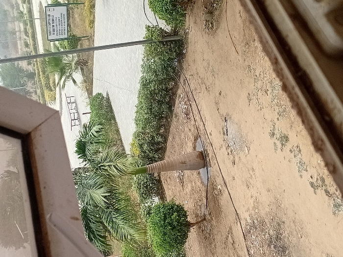 An elevated, downward-angled view captures an outdoor scene in Kwazailewa, Nigeria. The immediate foreground, partially obstructed by a window frame in the top-left and bottom-right corners, consists of dry, sandy earth with sparse green vegetation and scattered debris. A slender, small-leafed tree stands on the left. Centrally, a distinctive palm tree with a broad, conical base tapering upwards is rooted in a small puddle of water. A black hose or cable lies across the dirt ground, looping near the palm tree's base. Further into the midground, a paved pathway meanders through an area with manicured green hedges. Two unoccupied, rectangular outdoor tables are visible on a paved section. To the right, a white informational sign on a pole displays text, partially legible as "FACULTY OF COMPUTING" and "INFORMATION TECHNOLOGY." The background features additional trees and a hazy, light-colored distant horizon. No individuals are present in the scene.