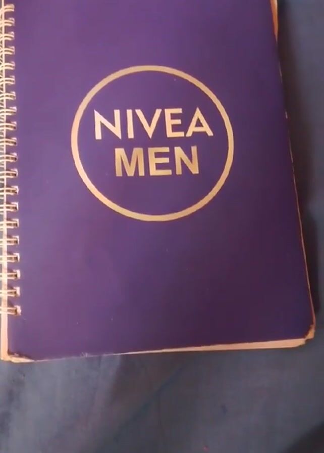 closed, spiral-bound notebook. The cover is dark blue with "NIVEA MEN" printed in gold within a gold circle. The notebook is resting on a blue surface.