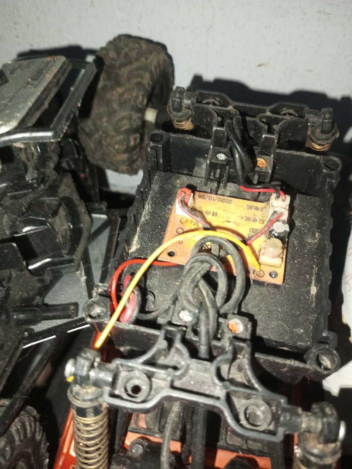 A close-up shows the internal mechanics of a toy car. Black plastic components house a circuit board dated "2020/10/28" with attached red and yellow wires. A tangle of black wires is also visible. A suspension system with springs and black struts connects to the chassis. A dirty tire is partially visible, indicating the toy's use.