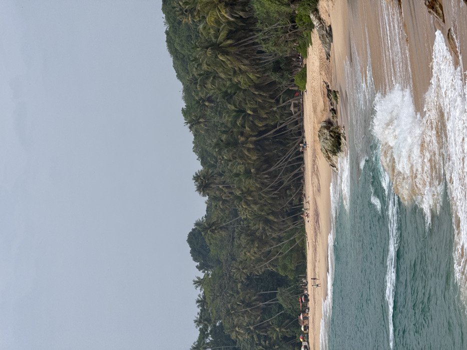 A coastal scene showcases a sandy beach lined with tall palm trees. Lush green vegetation covers the land bordering the beach. Waves crash onto the shore, creating white foam and turbulent water. Several people are scattered along the beach. The sky is overcast, contributing to the subdued lighting of the scene.