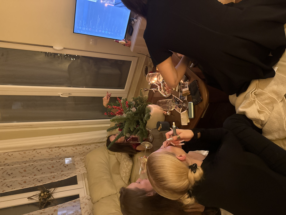Three women are gathered indoors. One with blonde hair sits in the foreground, seemingly applying makeup, while two others relax nearby. A coffee table holds assorted items including candles, wine glasses, and small accessories. A festive arrangement of greenery sits by the window. A television hangs on the wall, displaying content. The scene exudes a relaxed and intimate atmosphere.